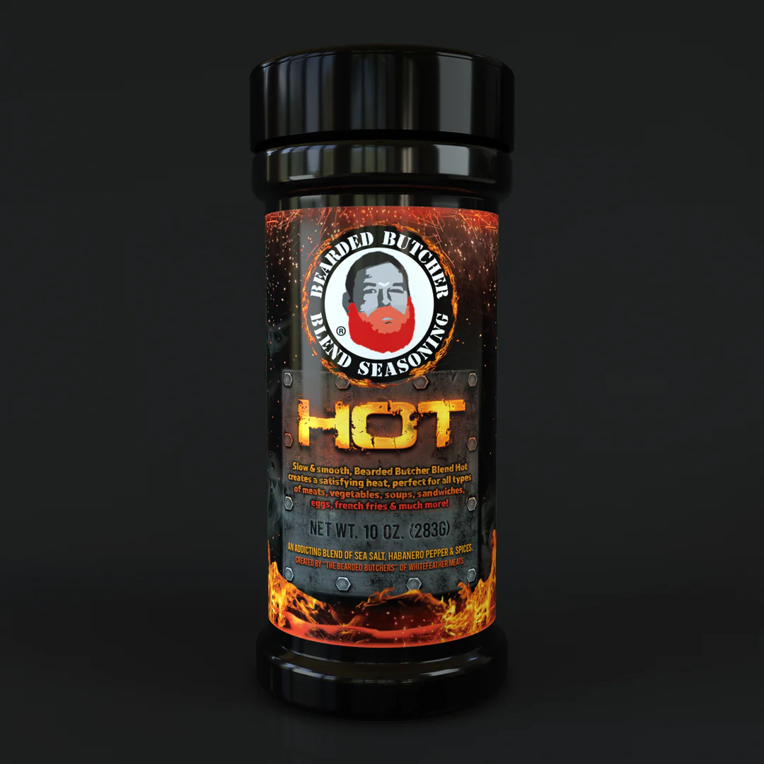 Bring the heat and complete your spice rack with our Bearded Butcher Blend Hot seasoning. This slow and smooth, red hot seasoning builds a satisfying whole-mouth heat that will ignite your taste buds. Take your home cuisine to the next level and witness the difference our blend of hot spices can make. You will not ever look at home cooking the same way again after experimenting with our hot seasonings.